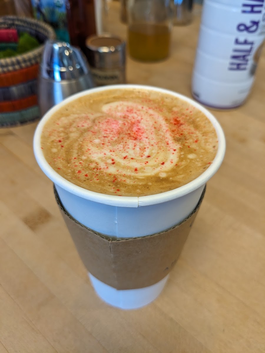 One of the best mochas I’ve ever had: the chili flavour provided a distinct palate pleaser! The atmosphere in the shop was cozy, and the staff were friendly. P.S. Always a delight to see original art and real plants!